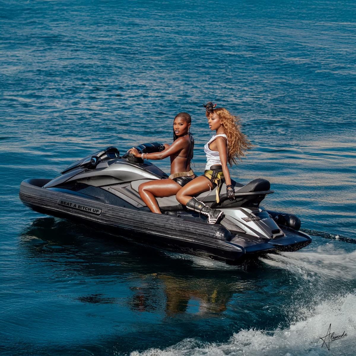 Alemeda opened up about the adrenaline-fueled shoot, proving she commits to the visuals as much as the venom in her verses. “Filming the video was such an incredible experience. I’d never been on the back of a jet ski before (I was low key scared ’cause I can’t swim) but I wanted to push myself to get the best shots possible. We even had a trained cat on set, per my request. Doechii looked stunning and brought such powerful energy—she gave me amazing direction throughout. And I am obsessed with the firework scene.”
